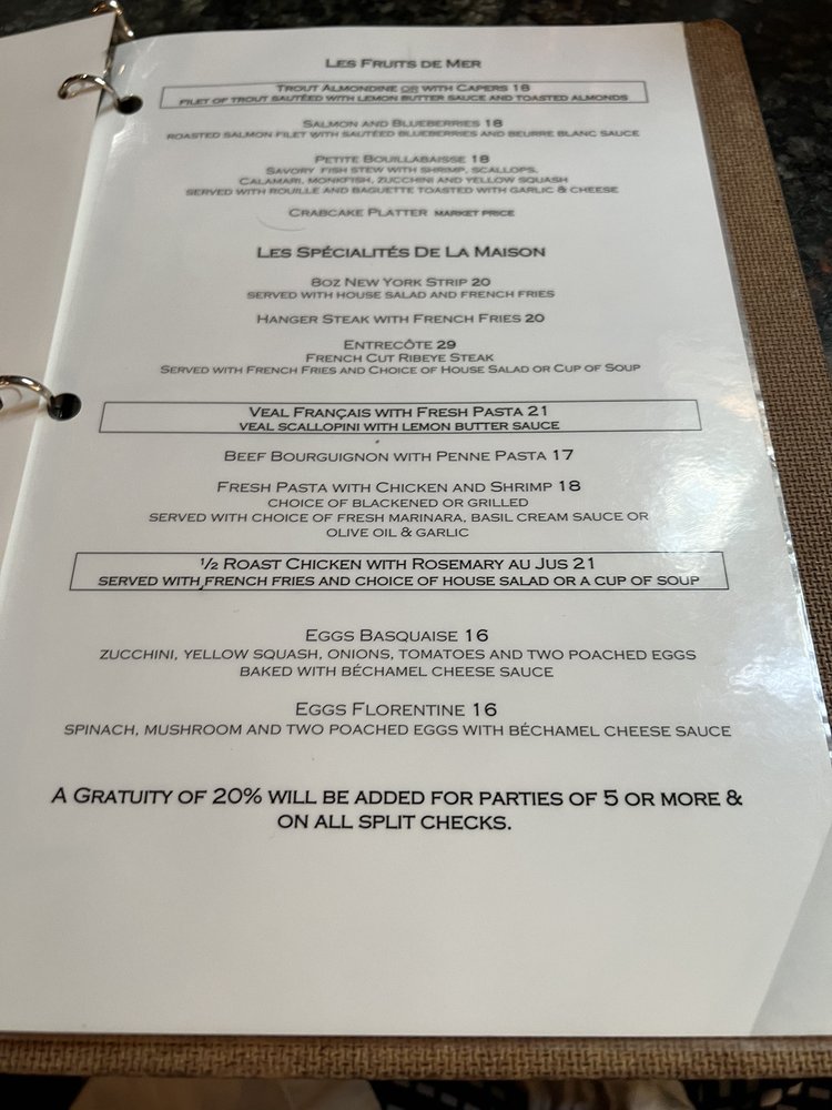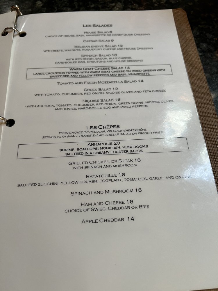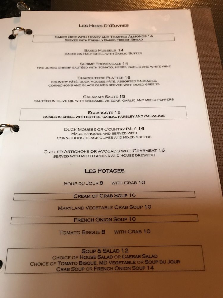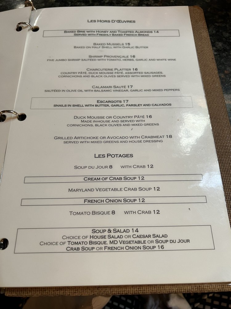 Café Normandie Restaurant, located in Annapolis, MD, has been serving up delicious French cuisine since 1986. The menu boasts a wide array of French specialties like escargot, bouillabaisse, and crepes, alongside American favorites like crabcakes and burgers. The Niçoise Salad with ahi tuna is a standout lunch option according to customers. The cozy and old-fashioned French Country chic ambiance adds to the charm of this establishment. The cream of crab soup and classic French onion soup are highly recommended starters, while the roasted corn risotto with scallops and roasted half duck with raspberry sauce are must-try entrées. The baked mussels appetizer and peach tart dessert are also highly praised. The restaurant ambiance with a fireplace and exposed wooden beams creates a warm and inviting atmosphere. Café Normandie Restaurant is a definite must-visit for those craving authentic French cuisine in a charming setting.